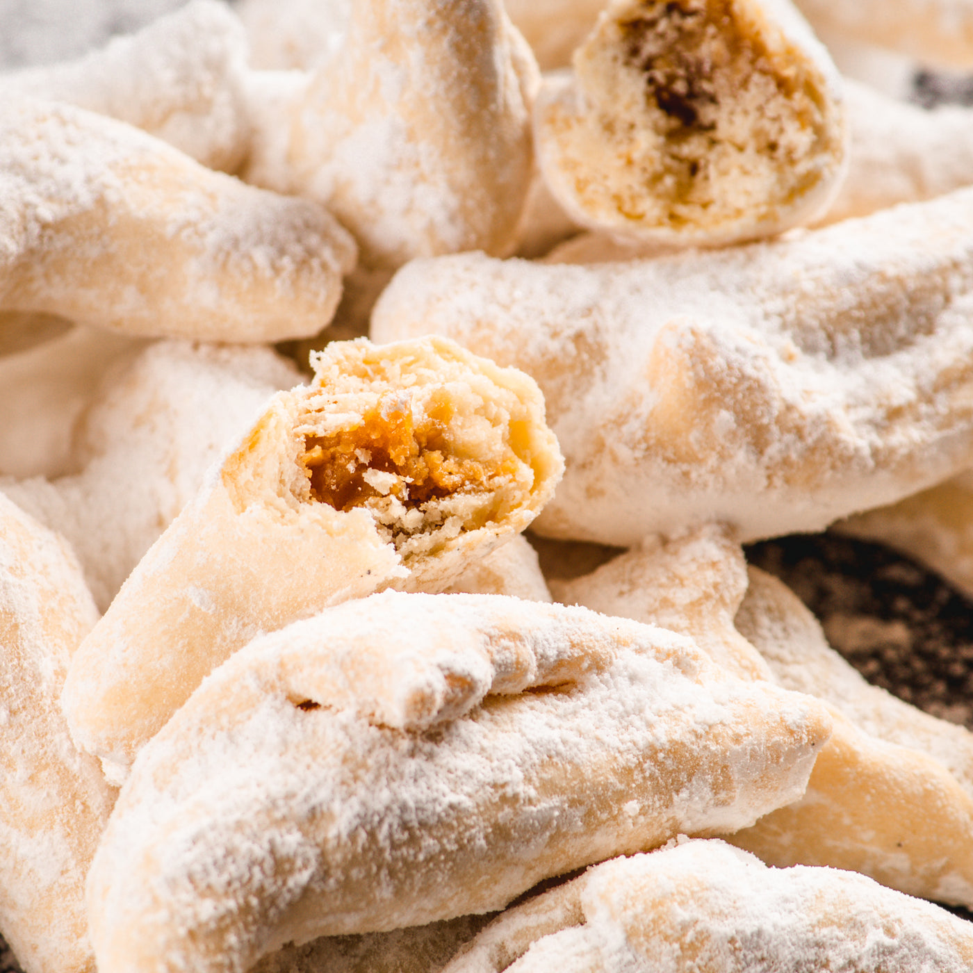 Galleta rellena de dulce de leche de la casa y nuez, espolvoreada en azúcar glass.